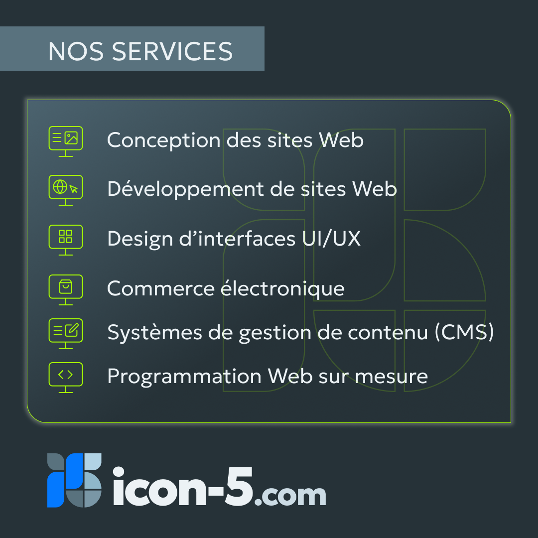 Située à Québec, icon-5 se spécialise dans la conception et le développement de sites Web remarquables, efficaces et conçus pour mieux répondre aux besoins de votre entreprise.